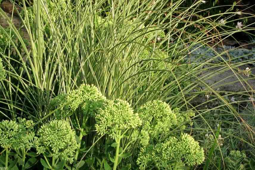 Miscanthus ‘Morning Light’, Sedum ‘Autumn Fire’, au mois d’août (© Cultivar 413)