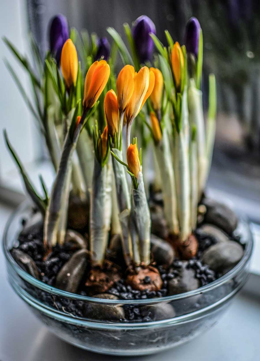 Vous pouvez cultiver vos crocus en intérieur et les faire fleurir plus tôt que prévu en les forçant. Vous pourrez ainsi avoir des fleurs dès janvier. Associez-les à d’autres bulbes qui peuvent être forcés, comme les jacinthes, narcisses ou muscaris. Plantez-les en pot en octobre, dans un substrat drainant, puis placez-les à l’obscurité et au frais, par exemple dans une cave. Deux mois plus tard, vous pourrez les sortir pour les installer à température ambiante, à un emplacement lumineux, et profiter de leur floraison !