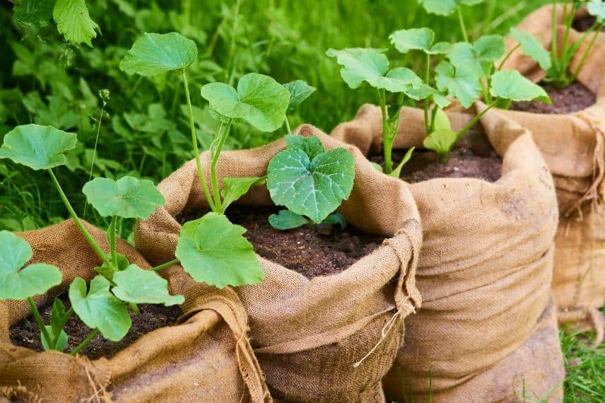 Des plants de courgette dans des sacs en toile de jute.