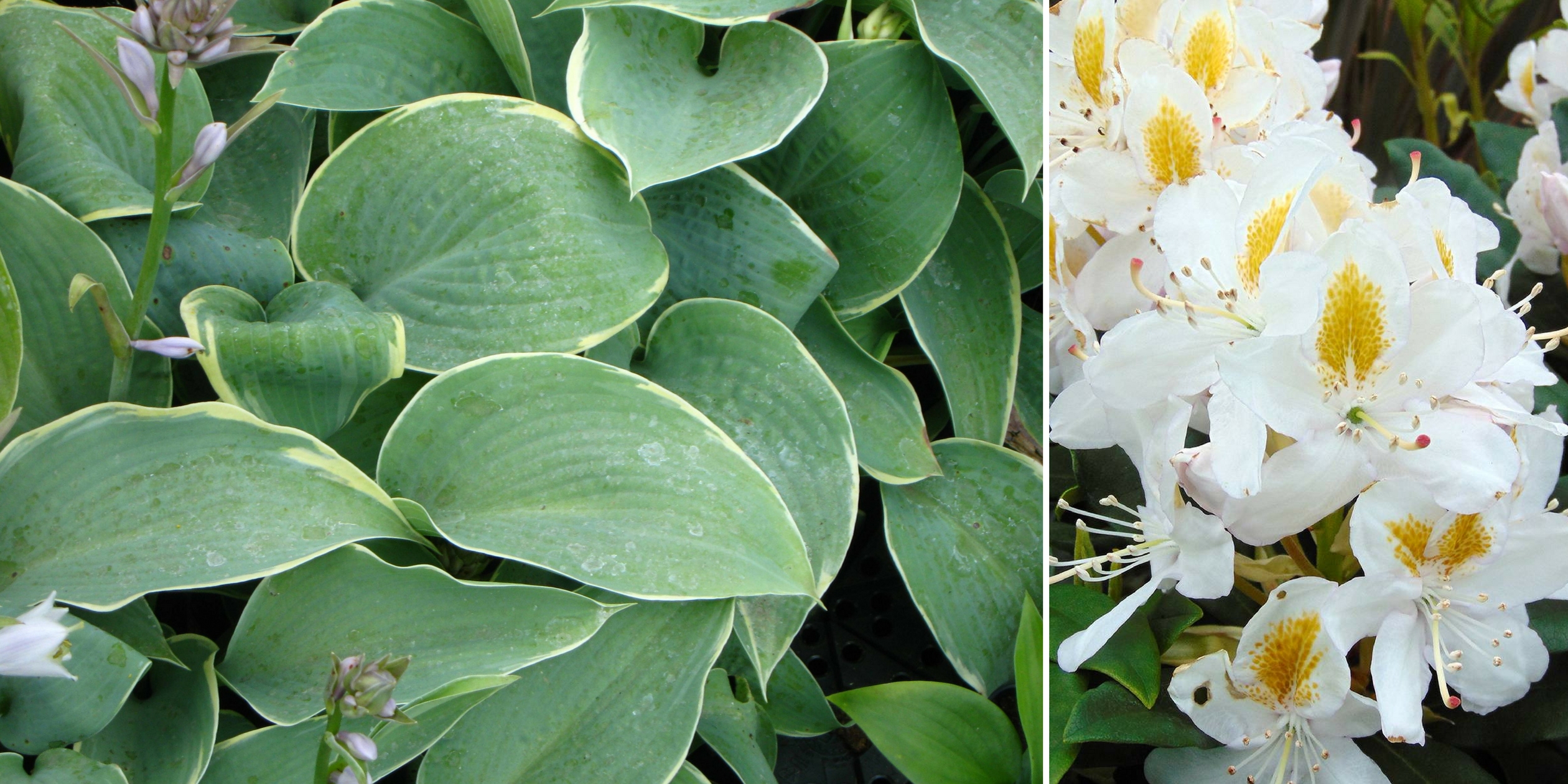 Hosta ‘Frosted Dimples’ – Rhododedron ‘Madame Masson’