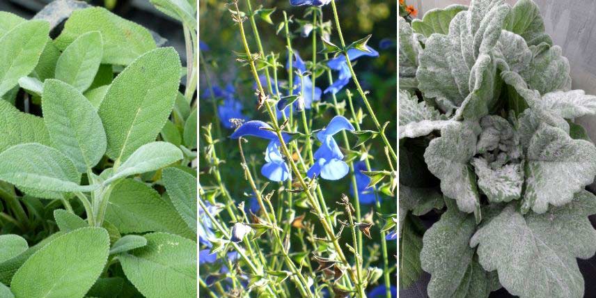 Les sauges peuvent également se démarquer par les teintes de leur feuillage. Ainsi, Salvia officinalis ‘Tricolor’ porte des feuilles vert – gris, marginées de blanc crème, et marquées de pourpre – rosé sur les jeunes pousses. La variété Salvia ‘Icterina’, elle, offre des feuilles vertes panachées de jaune doré, ce qui la rend vraiment lumineuse ! On apprécie aussi la variété ‘Golden Delicious’, aux feuilles vert-jaune ! La sauge argentée, Salvia argentea, est intéressante également par son feuillage ample, gris et duveteux. Si vous souhaitez une teinte plus sombre, pourprée, optez plutôt pour Salvia officinalis ‘Purpurascens’.