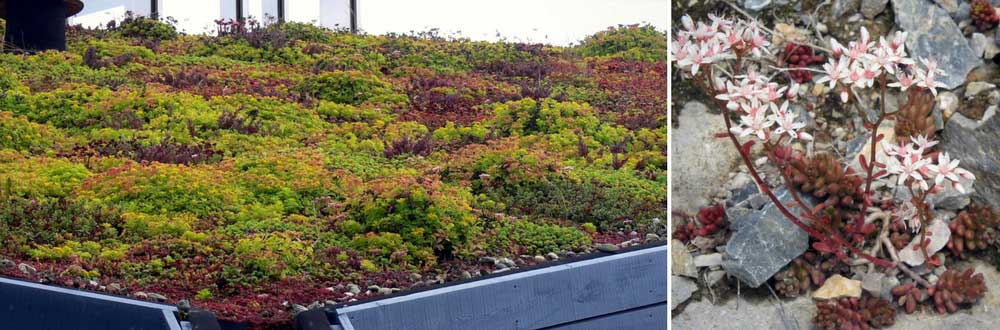 Le sédum est particulièrement adapté aux toitures végétalisées, car il a la capacité de résister à des températures très élevées comme très basses (importante rusticité), au vent et à la sécheresse. Il demande ainsi peu d’entretien, pas d’arrosage, et ses racines peu profondes permettent de le cultiver sur une très fine couche de substrat.