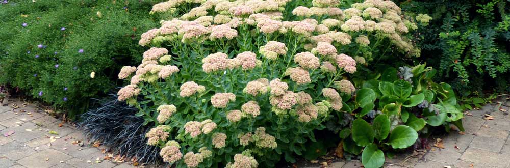 Choisissez des variétés hautes, comme le Sedum ‘Herbstfreude’, ou le Sedum ‘Matrona’ – une variante au feuillage pourpre – que vous planterez par groupe de 5 à 7 pieds. Vous pouvez placer devant eux quelques sédums tapissants, comme le Sedum kamstchaticum, à la belle floraison jaune très lumineuse qui ressortira parmi ces feuillages plus sombres. Positionnez quelques touffes de graminées de part et d’autre (Pennisetum ou Stipa). Elles apporteront de la légèreté et créeront un joli contraste face au feuillage et port plus massif des sédums.