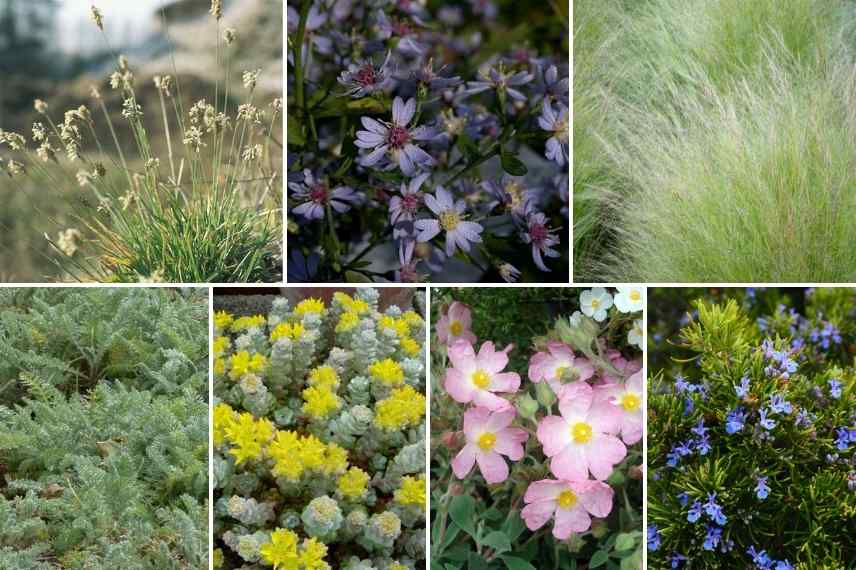 Stipa argentea, Aster cordifolius ‘Ideal’, Stipa tenuissima, Achillea crithmifolia, Sedum spathulifolium ‘Cape Blanco‘, Cistus argenteus et Romarin rampant