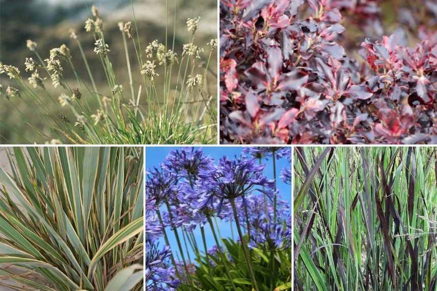 Sesleria caerulea, Pittosporum ‘Tom Thumb’, Phormium tenax, Agapanthes et Panicum virgatum ‘Blue Darkness’