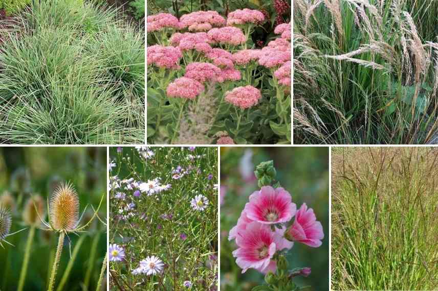 Sesleria nitida (© Carolyn Willitts), Sedum spectabile, Stipa calamagrostis, Cardère, Asters turbinellus, roses trémières et Pancium virgatum ‘Squaw’