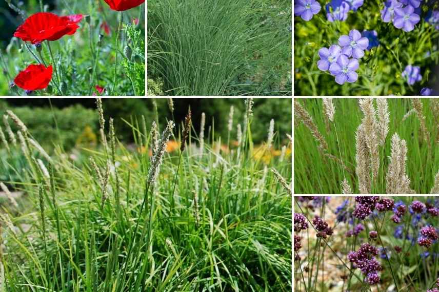 Sesleria automnalis entourée de pavots d’Orient, d’un Miscanthus ‘Gracillimus’, du bleuté de lins vivaces, de Melica ciliata et de verveines de Buenos Aires