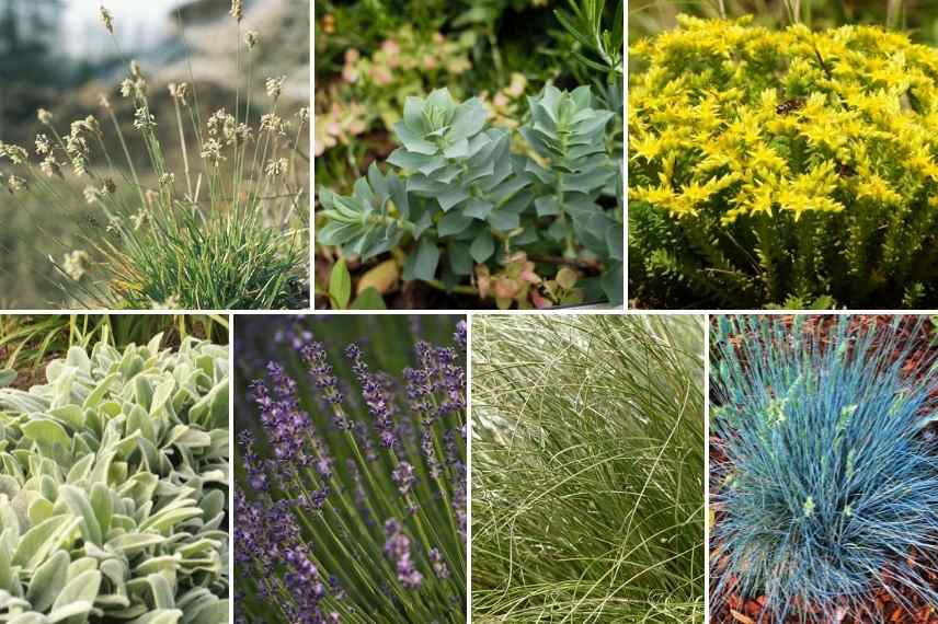 Sesleria caerulea, Euphorbia myrsinites, Sedum sexangulare, Stachys lanata, lavande, Carex comans ‘Frosted Curls’ et Festuca ‘Elijah Blue’