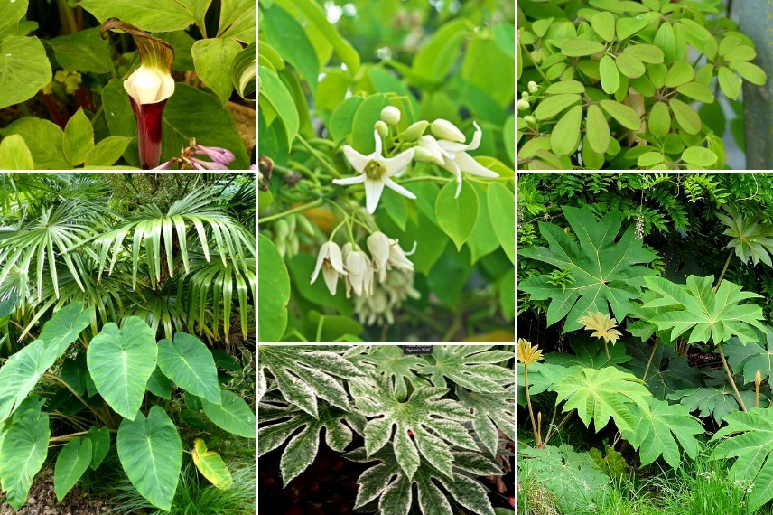 Le Stauntonia offre un feuillage généreux avec des feuilles palmées dont la forme rappelle un peu celui du Schefflera. Profitez de cette belle liane peu commune pour composer un jardin-jungle, de style exotique, en l’associant à d’autres plantes au feuillage luxuriant. Pensez par exemple au Tetrapanax, Fatsia japonica, Astilboides tabularis, Gunnera, et aux hostas géants (par exemple ‘Empress Wu’). L’idée est de créer un vrai sentiment d’opulence végétale, avec des feuillages qui débordent des massifs et s’entremêlent les uns aux autres. Découvrez le beau feuillage découpé du Datisca cannabina, une vivace monumentale qui peut atteindre 2,50 m de hauteur ! Pensez aux akebias, une grimpante assez proche du Stauntonia, qui donne, elle aussi, de belles feuilles palmées, composées de folioles vert clair et ovales. Sans oublier les fougères, le bananier Musa basjoo, le Melianthus major, les bambous et palmiers (par exemple le Trachycarpus fortunei). Découvrez aussi la floraison surprenante de l’Arisaema griffithii, qui évoque la tête d’un cobra. Pour ce qui est des arbres et arbustes, pensez au Catalpa, à l’Albizia et au Paulownia tomentosa.