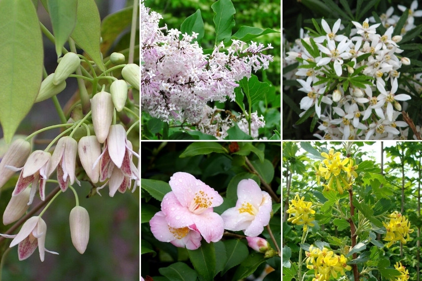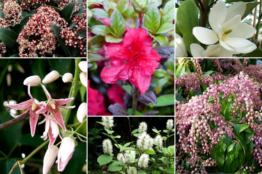 Comme le Stauntonia se plait en terrain acide et à mi-ombre, il est parfait pour accompagner des arbustes de terre de bruyère. Associez-le par exemple à l’Andromède du Japon, Pieris japonica, qui porte au printemps de jeunes feuilles rouges, qui verdissent ensuite, et des fleurs en clochettes blanches ou roses. Profitez aussi de la floraison généreuse des azalées et rhododendrons, ainsi que de celle du Skimmia. Découvrez le Fothergilla gardenii, un petit arbuste très original qui offre une belle floraison en épis plumeux blancs. Pensez aussi au Crinodendron hookerianum, qui porte des fleurs ressemblant à de petites lanternes rouges, ainsi qu’au Michelia yunnanensis et ses belles fleurs blanches en coupe. La plupart de ces arbustes offrent une floraison blanche ou rosée, ce qui vous assurera un massif harmonieux et très délicat. Enfin, le Leucothoe mérite lui aussi sa place à leurs côtés avec son beau feuillage dont la teinte change au fil des saisons.