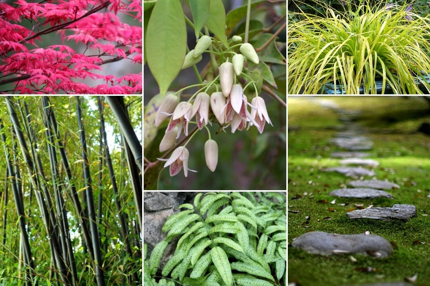 Originaire du Japon et de Corée, le Stauntonia avec son humble floraison en clochettes et son feuillage généreux s’intégrera facilement dans un jardin zen, en compagnie d’autres plantes asiatiques. Composez un petit jardin apaisant, sobre et épuré, par exemple dans un patio ou une cour intérieure. Intégrez des érables du Japon, pour leur silhouette élégante et leur feuillage palmé et coloré, ainsi que des Hakonechloa macra, hostas et Nandina domestica. Pensez au feuillage graphique des fougères : nous vous conseillons par exemple le Cyrtomium falcatum ou le Coniogramme emeiensis. Délimitez le jardin avec une barrière de bambous : qu’il s’agisse de grands bambous comme le Phyllostachys nigra, aux superbes cannes noires, ou de bambous nains comme le Pleioblastus pygmaeus ‘Distichus’, qui ne dépasse pas 60 cm de haut. Là aussi, les azalées, rhododendrons, Pieris japonica et camélias trouveront leur place aux côtés du Stauntonia. Découvrez aussi les belles primevères japonaises, comme la Primula japonica ‘Alba’. N’oubliez pas non plus d’intégrer quelques éléments de décoration (avec parcimonie) : par exemple un portique, des lanternes, une statue… Vous obtiendrez un jardin propice à la méditation et idéal pour se ressourcer !