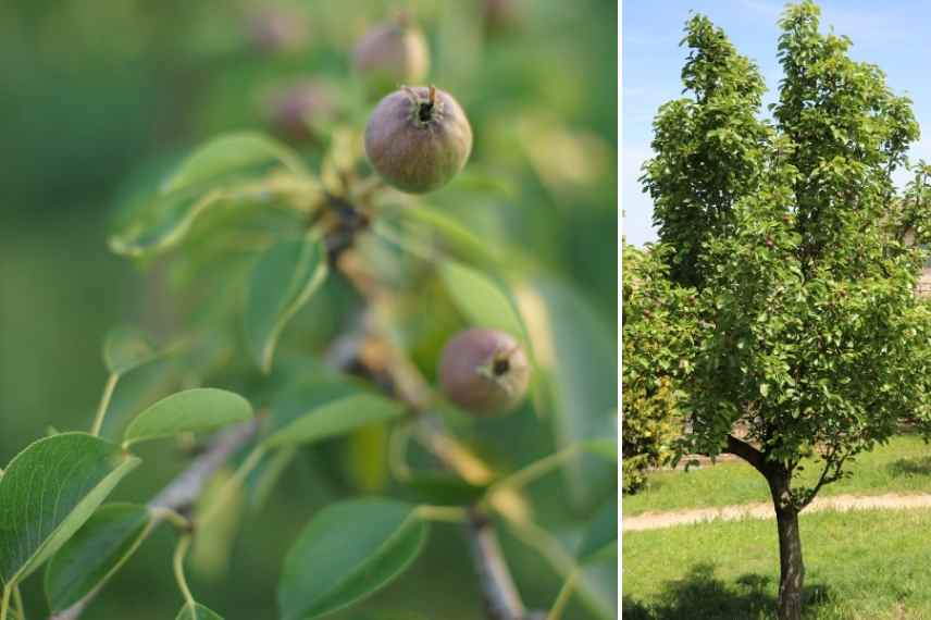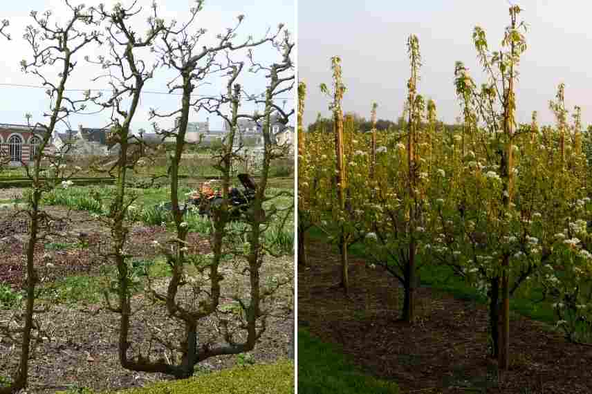 - aux arbres à pépins (pommier, poirier, cognassier…) conduits en petites formes palissées ;