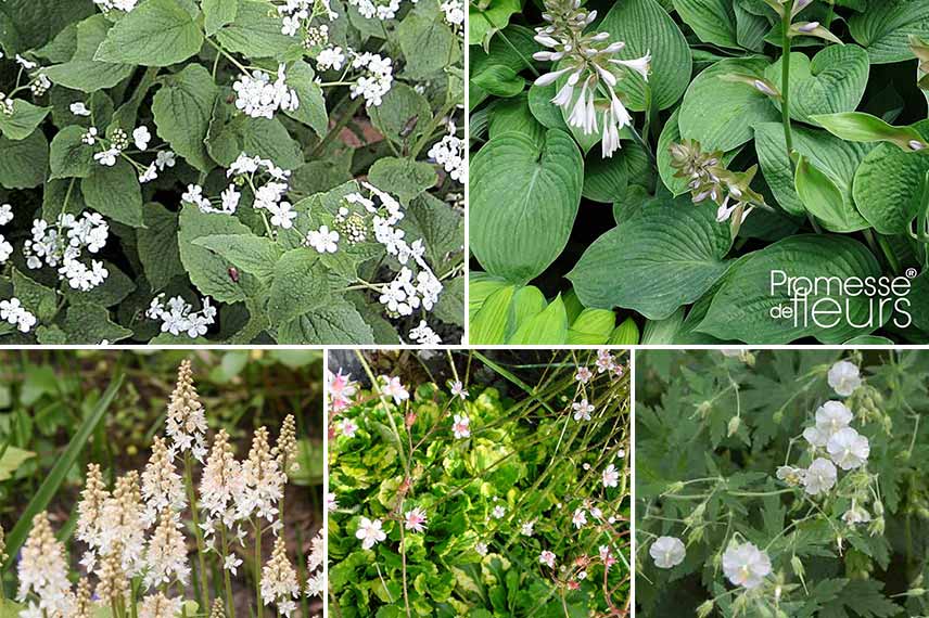 Apportez différentes tonalités de vert avec les feuillages d’hostas qui se plairont à l’ombre comme la variété ‘Frances Williams’, des graminées comme des carex qui vont apporter de la légèreté et des Brunneras macrophylla ‘Jack Frost’, très discrets par leur floraison mais originaux avec leurs feuilles argentées veinées de vert. Aussi bien les tiarelles que les Heucherellas trouveront une place de choix parmi ces belles d’ombre, en déployant leur forme couvre-sol.