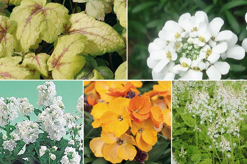 Créez une association jaune et blanche avec le feuillage jaune veiné de pourpre de l’Heucherella ‘Stoplight’, la floraison blanche de l’Iberis ‘Snowflake’ et de la giroflée ‘Heritage White’, quelques touches de jaune avec l’Erysimum ‘Rysi Copper’ et pour finir, les épis vaporeux blancs de la Tiarella ‘Appalachian Trail’