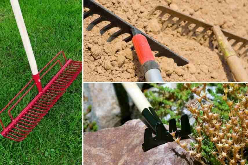 - Pour le gravier : un râteau à gravier à dents recourbées.
