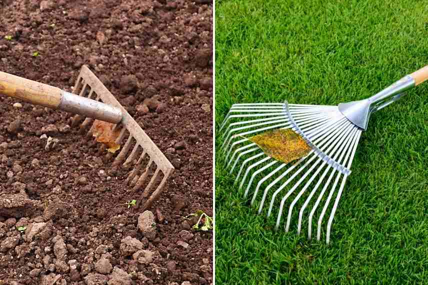 - Pour le potager et la réalisation de massifs et parterres : un râteau classique ou râteau à potager, encore appelé râteau traditionnel à dents droites ou légèrement recourbées.