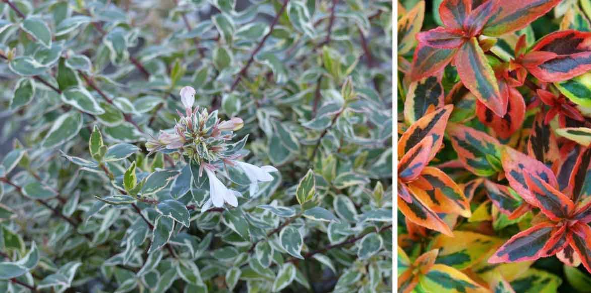 Vertes foncé et lustrées tout l’été chez la plupart, elles sont remarquablement panachées chez certains offrant un feuillage doré aux reflets changeants suivant les saisons : l’Abelia ‘Confetti’ porte des feuilles vert clair marginées de blanc-crème qui révèlent de belles teintes roses dès les premiers frimas, l’Abelia grandiflora ‘Francis Mason’, un feuillage vert sombre panaché de jaune d’or.