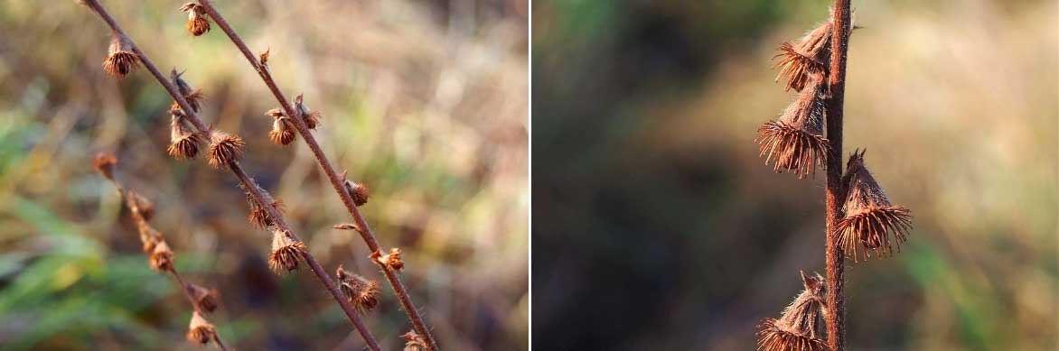 Les fruits de l’aigremoine sont des akènes, dont chacun renferme une à deux graines. Ils ont la particularité d’être munis de petits crochets qui leur permettent de s’accrocher aux poils des animaux ou aux vêtements. Cela permet à la plante de disséminer les graines loin du pied d’origine. Au jardin, l’aigremoine a tendance à se ressemer spontanément.
