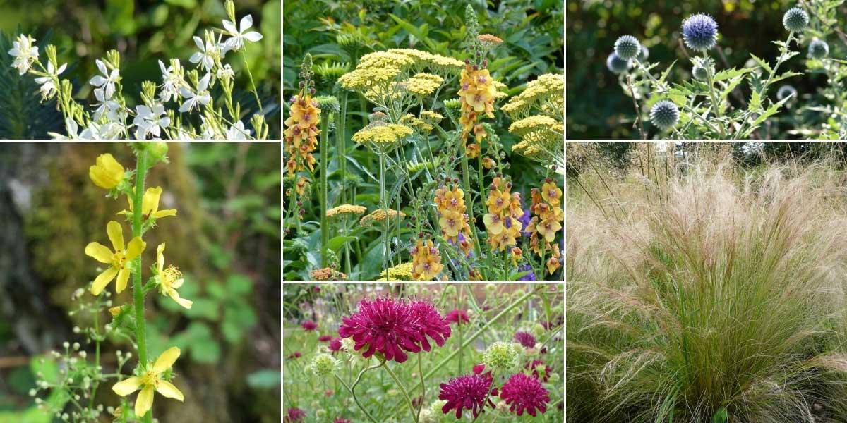 L’aigremoine s’intègre facilement dans un jardin naturaliste ! Gaura lindheimeri ‘Snowbird’, Achillée ‘Terracotta’ et Verbascum ‘Helen Johnson’, Echinops sphaerocephalus (photo F. D. Richards), Agrimonia eupatoria, Knautia macedonica (photo Epibase), et Stipa tenuifolia