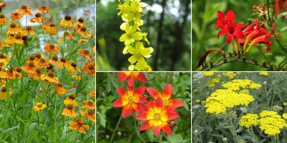 N’hésitez pas à accompagner l’aigremoine de floraisons aux tons chauds et lumineux ! Helenium ‘Waltraut’, Agrimonia eupatoria (photo Joan Simon), Crocosmia masoniorum, Bidens ‘Campfire Fire Wheel’, et Achillea ‘Moonshine’
