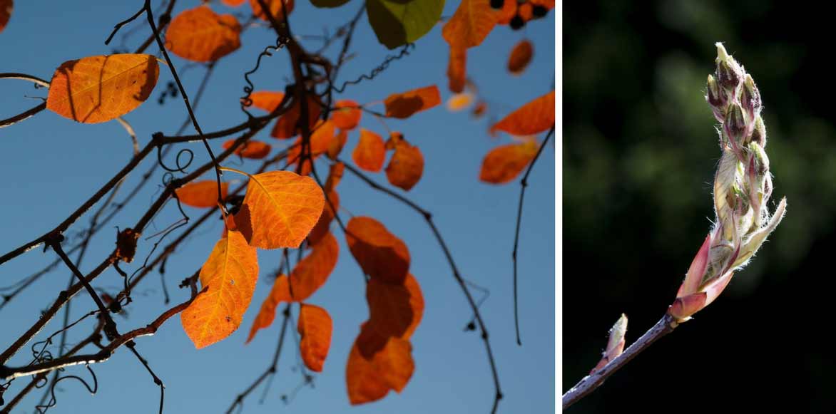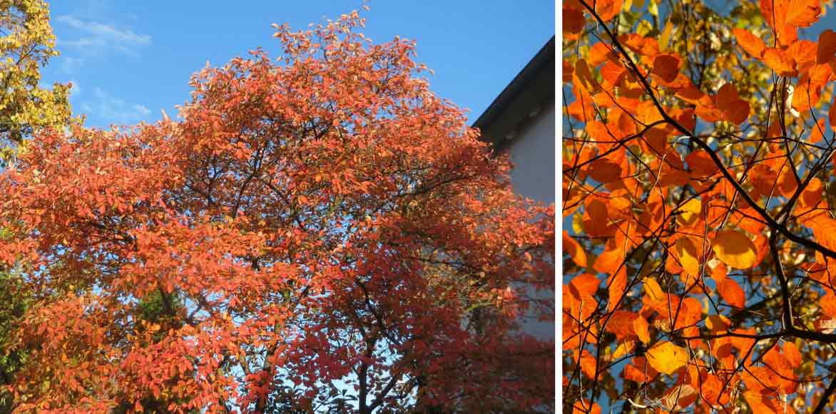A l’automne, ses feuilles aux flamboiements cuivre ou pourpres répondront classiquement aux baies orange vif d’un Cotonéaster ou d’autres arbres à fruits décoratifs (lien) comme un Sorbier du Cachemire.