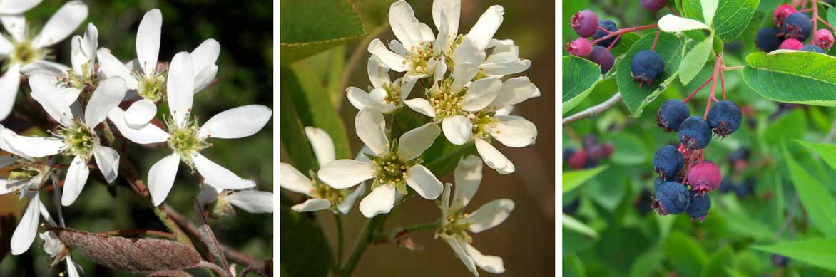 Les fleurs étoilées de l’Amélanchier Lamarckii et d’A. spicata cèdent la place à de délicieuses baies comestibles