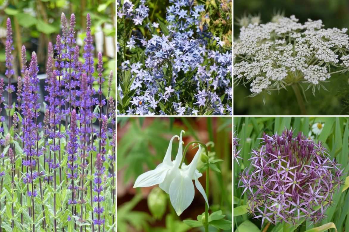 Un exemple d’association : Salvia nemorosa ‘Caradonna’, Amsonia orientalis, Selinum wallichianum (ou bien Cenolophium denudatum), Aquilegia vulgaris ‘Munstead White’ et Allium christophii