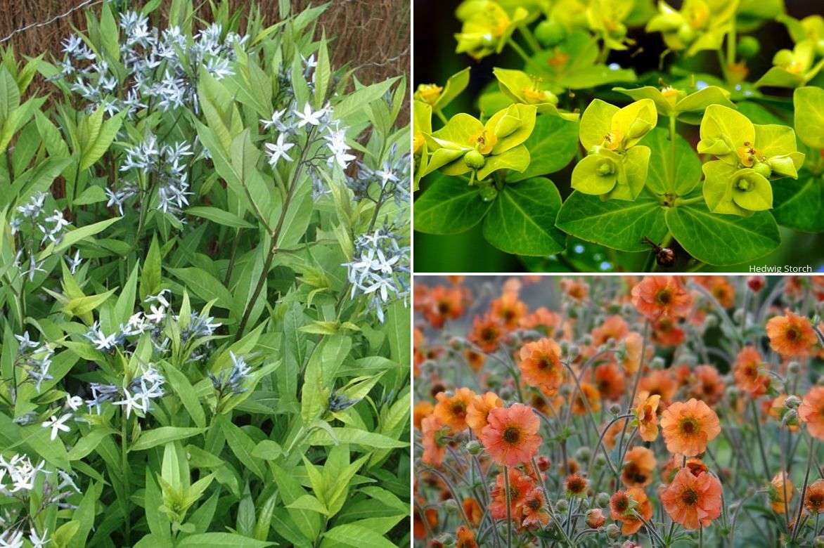 Un exemple d’association contrastée : Amsonia tabernaemontana var. salicifolia, Euphorbia cornigera ‘Goldener Turm’ et Geum ‘Totally Tangerine’
