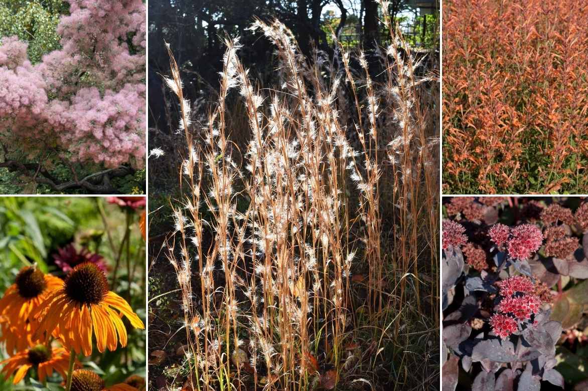 Couleurs d’automne dans un massif avec des Andropogons, un Cotinus coggygria, les Echinacées ‘Tangerine Dream’, des Panicums virgatum ‘Hot Rod’ et quelques Sedums hybride ‘Jose Aubergine’