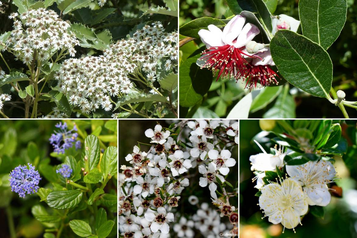 Un exemple d’association pour bord de mer : Olearia virgata, Acca sellowiana ‘Coolidge’, Ceanothus impressus ‘Victoria’, Leptospermum scoparium ‘Blanc’, Myrtus communis ‘Tarantina’.