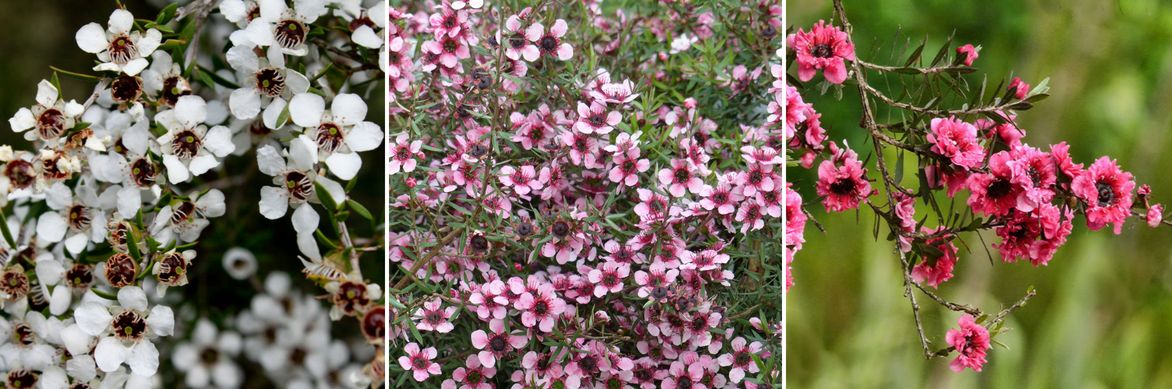 Fleurs de l’Arbre à thé, simple ou double : Leptospermum scoparium ‘Blanc’ (Photo B. Gratwicke), Leptospermum scoparium ‘Martini’, Leptospermum scoparium ‘Red Damask’ (Photo Sid Mosdell).