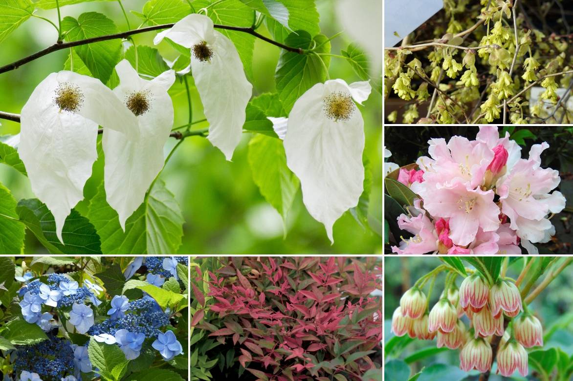 Une idée d’association en terre acide, au fil des saisons : Davidia involucrata ‘Sonoma’, Corylopsis pauciflora, Rhododendron ‘Dream Land’, Enkianthus campanulatus, Nandina domestica ‘Obsessed Seika’, Hydrangea macrophylla ‘Twist and Shout’