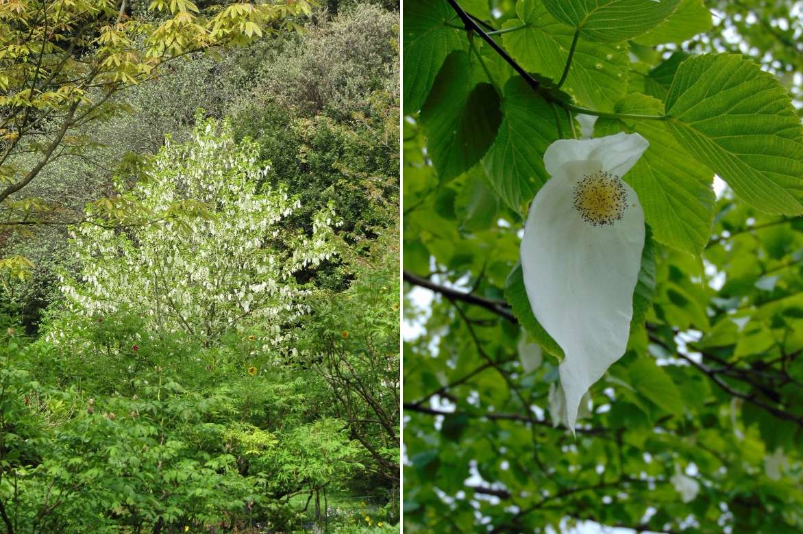 Vers l’âge de 10-12 ans, les branches se couvrent d’un foisonnement de « mouchoirs » blancs, longs de 15 à 20 cm qui lui ont valu ses multiples dénominations. En réalité, ces organes ne sont pas les fleurs mais des bractées, inégales et appariées par deux autour de l’inflorescence comme dans le cas du poinsettia ou de la bougainvillée et portées par un long pédoncule. Les fleurs minuscules forment une sphère de 2 cm de diamètre au creux des bractées, composées d’étamines ou de pistils.
