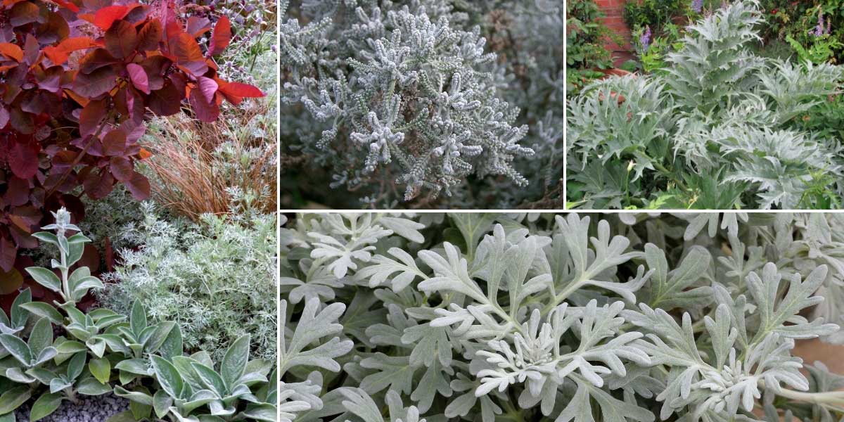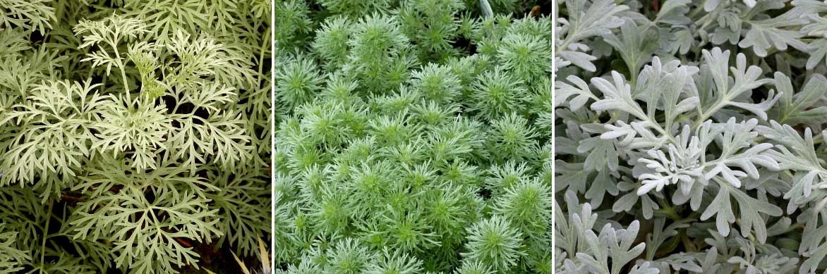 Le feuillage des armoises est joliment découpé. Artemisia ‘Powis Castle’, Artemisia schmidtiana ‘Nana’ et Artemisia stelleriana ‘Silver Brocade’