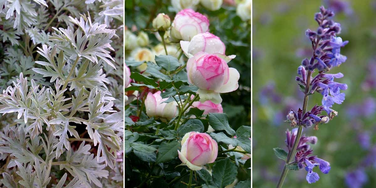 Pour une ambiance romantique, vous pouvez planter au pied de vos rosiers des armoises en compagnie de népétas ou d’astrances. Artemisia absinthium (photo Epanto) / Rosier grimpant ‘Pierre de Ronsard’ / Nepeta faassenii