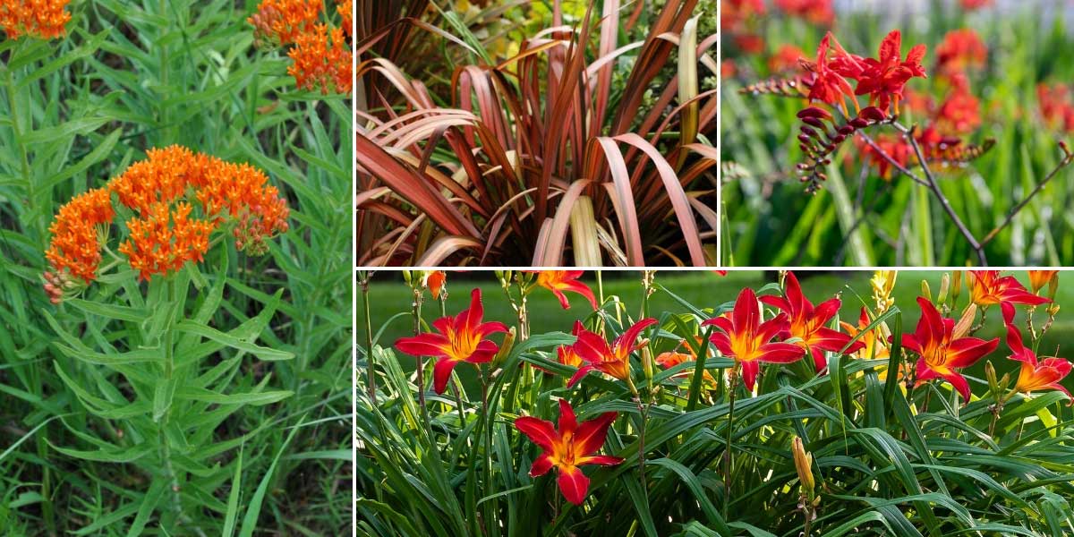 Les asclépiades à fleurs orange vif, jaune ou rouge, trouvent plutôt leur place dans les jardins de style exotique. Asclepias tuberosa (photo Aaron Carlson), Phormium ‘Pink Panther’, Crocosmia et hémérocalles