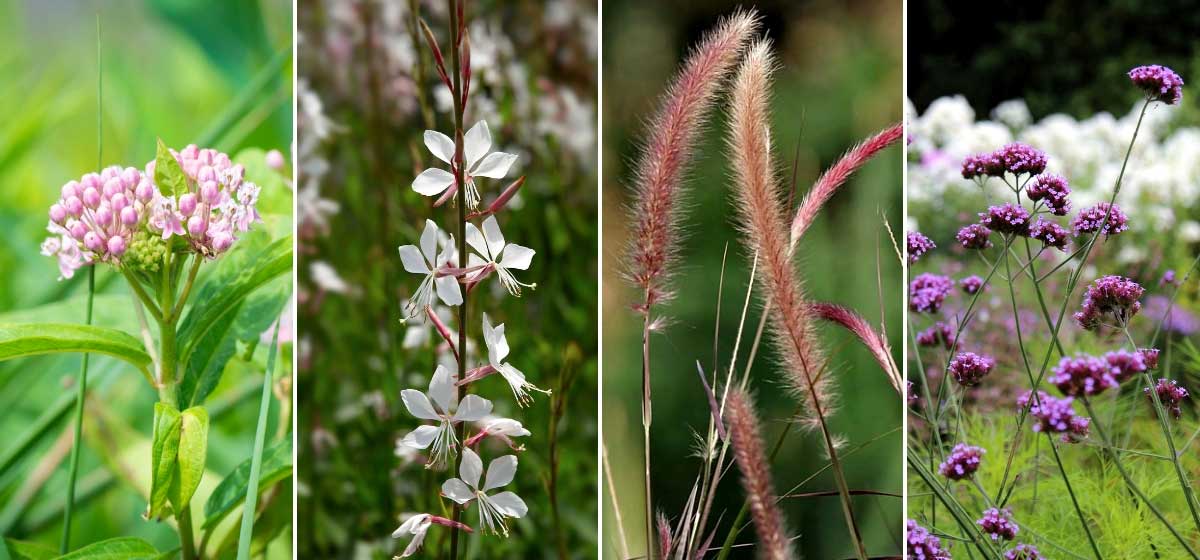 Les asclépiades à teinte rose ou mauve peuvent entrer dans la composition de massifs naturalistes. Asclepias incarnata (photo Andrew C.), Gaura lindheimeri ‘Whirling Butterflies’, Pennisetum setaceum et Verbena bonariensis (photo Acabashi)
