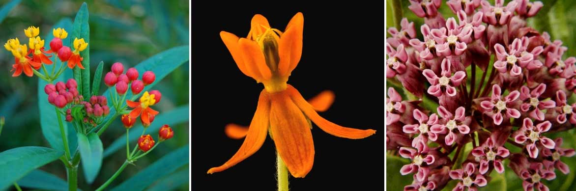 La floraison des Asclepias curassavica (photo Derek Ramsey), Asclepias tuberosa, et Asclepias sullivantii (photo Frank Mayfield)