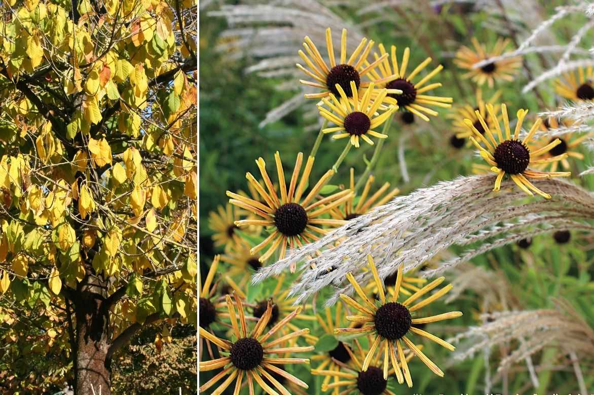 Une idée d’association automnale : Asimina triloba, avec devant lui au soleil une mer de Rudbeckia subtomentosa ‘Little Henry’ et de Miscanthus sinensis ‘Little Miss’. Si vous souhaitez un peu de contraste, ajoutez un Cotinus à feuillage pourpre.