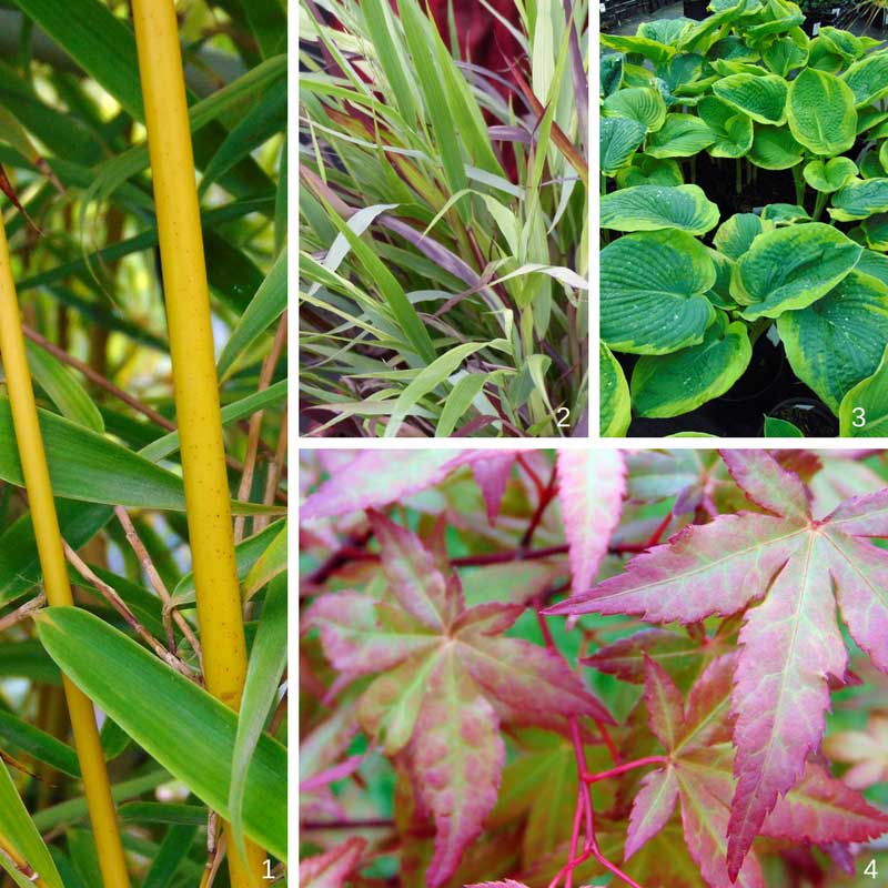 1) Fargesia robusta Campbell – 2) Hakonechloa macra Beni Kase – 3) Hosta sieboldiana Frances Williams – 4) Acer palmatum Redwine