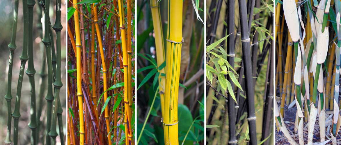 Leurs couleurs varient du vert moyen intense, au vert anis, au vert olive, au rose-jaune, au jaune vif ou au presque doré en passant par le noir, l’acajou ou même le bleu acier. Souvent, les chaumes changent de teinte progressivement avec le temps et le soleil, passant du vert au jaune soufre, gris, rose ou rouge. Ainsi, des cannes d’âge différent, présentant des teintes variées cohabitent dans une belle harmonie.