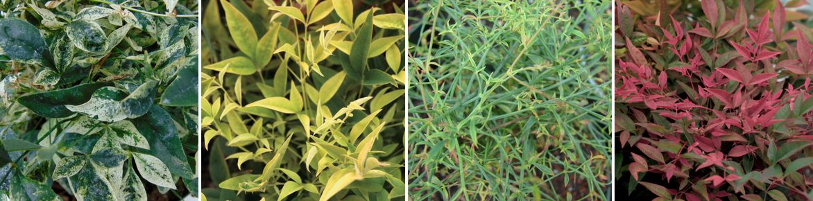 Divers feuillages : Nandina domestica ‘Twilight’, Nandina domestica ‘Lemon Lime’, Nandina domestica ‘Filamentosa’, Nandina domestica ‘Obsessed Seika’.
