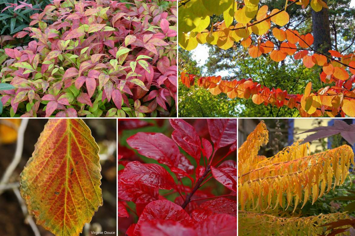 Une idée d’association automnale : Nandina domestica ‘Gulf Stream’, Cercidiphyllum japonicum, Hamamelis intermedia ‘Jelena’, Cotinus ‘Grace’, Rhus typhina ‘Tiger Eyes’.