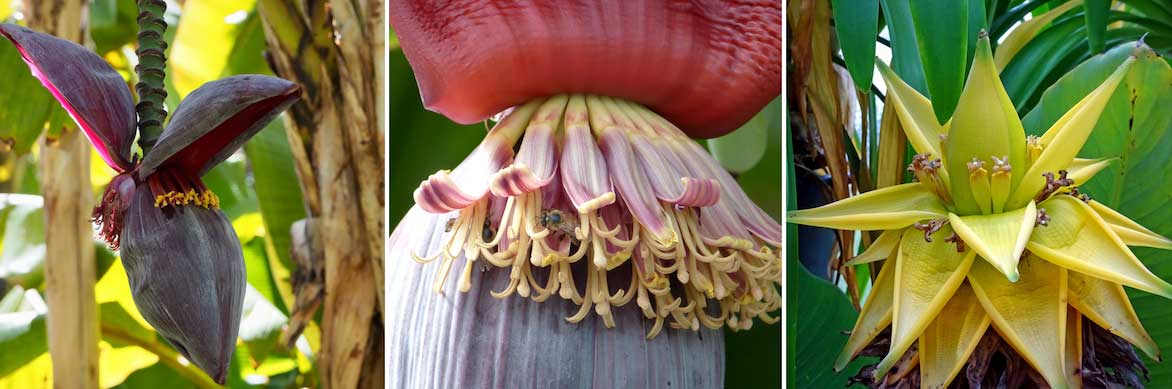 La floraison d’un bananier / Détail des fleurs, rassemblées sous une bractée / La floraison jaune du Musella lasiocarpa (photo Stefan Bellini)