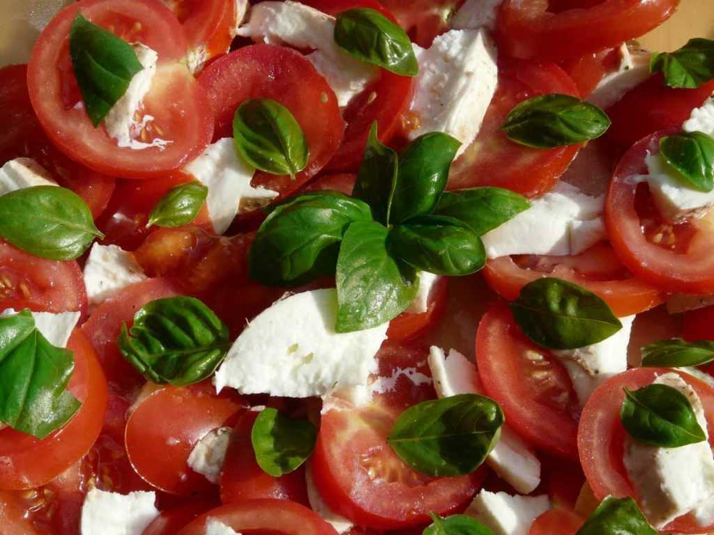 La célèbre salade italienne Caprese (tomate mozzarella) se réalise à partir de tomates et de mozzarella coupées en tranches et disposées de manière alternée. Elle et se parsème de feuilles ciselées de basilic, et est assaisonnée d’un filet d’huile d’olive, de sel et de poivre.