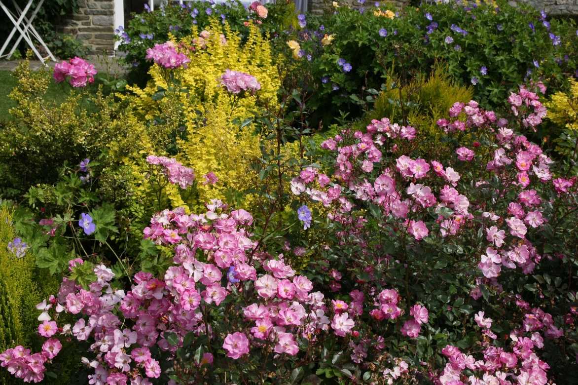 Un exemple d’association pétillante : Rosier ‘Lavender Dream’, Geranium ‘Rozanne’, Berberis thunbergii ‘Aurea Nana’