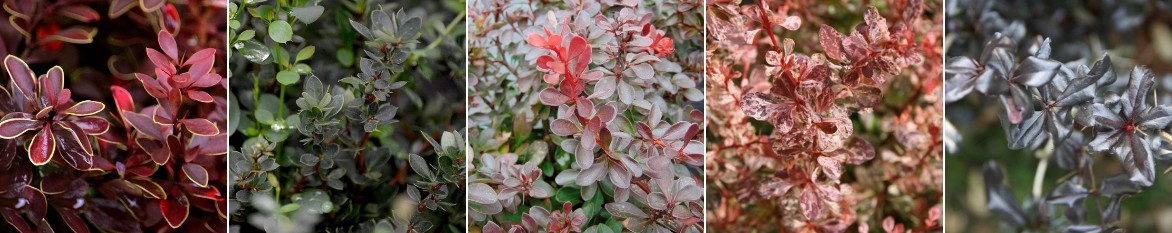 Quelques Epines-Vinettes aux feuillages décoratifs : Berberis thunbergii ‘Admiration’, Berberis buxifolia ‘Nana’, Berberis thunbergii ‘Atropurpurea Nana’, Berberis thunbergii ‘Rosy Glow’, Berberis thunbergii ‘Thunderbolt’