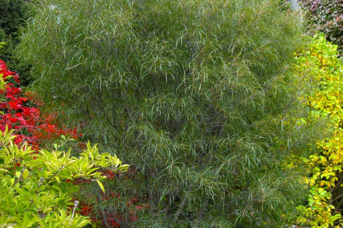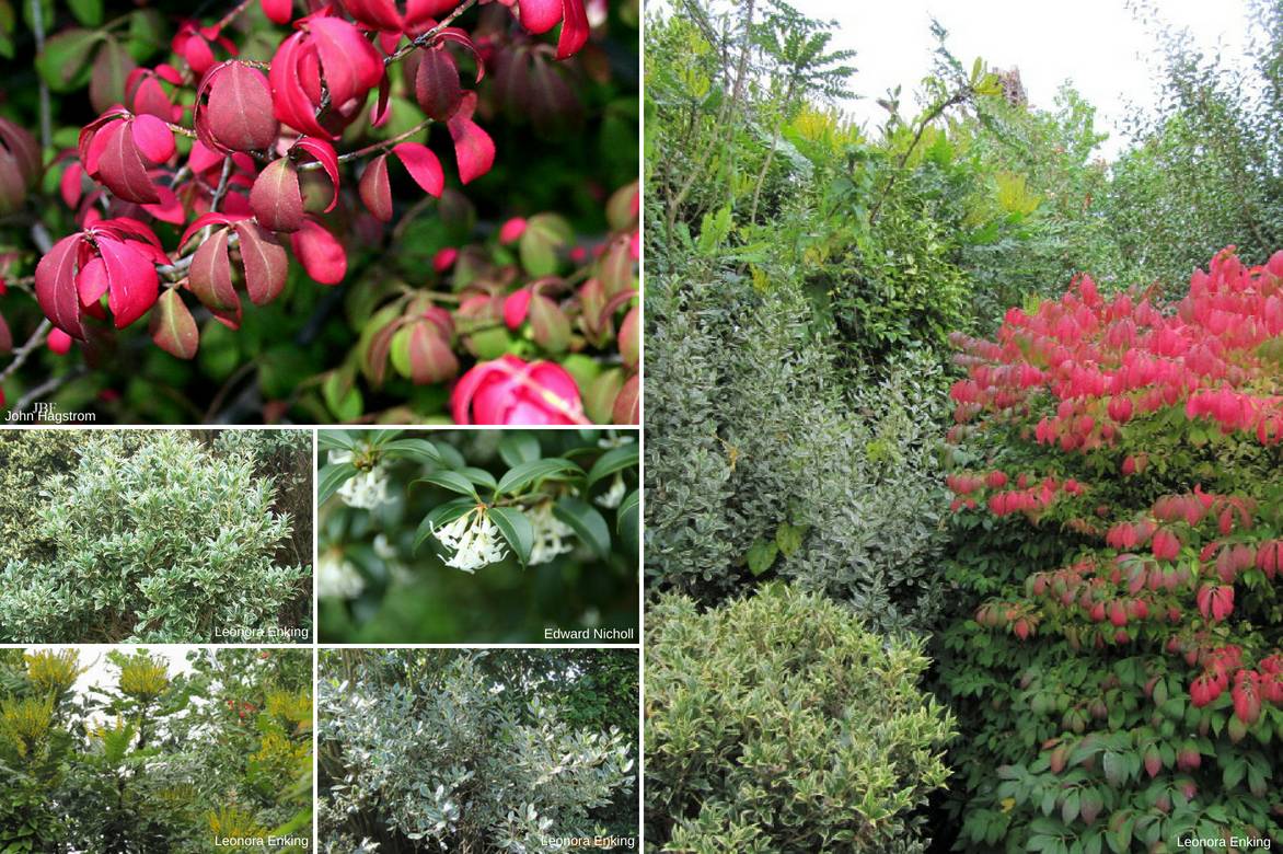 Un exemple d’association : Euonymus alatus ‘Compactus’, Osmanthus heterophyllus ‘Variegata’, Osmanthus burkwoodii, Mahonia ‘Lionel Fortescue’ (Le Mahonia ‘Winter Sun est une variété proche avec ses longues inflorescences jaunes doux), Rhamnus alaternus ‘Argenteovariegata’.