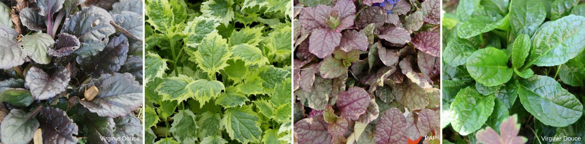 La plupart des bugles possèdent des feuilles décoratifs : Ajuga reptans ‘Black Scallop’, Ajuga incisa ‘Frosted Jade’, Ajuga ‘Burgundy Glow’, Ajuga reptans.