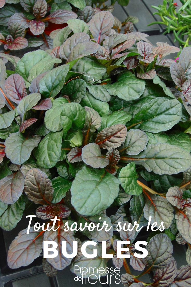 Les bugles présentent plusieurs couleurs : Ajuga reptans ‘Black Scallop’, Ajuga reptans Purple Torch, Ajuga reptans’ Burgundy Glow’, Ajuga reptans ‘Sanne’, Ajuga incisa ‘Frosted Jade’.